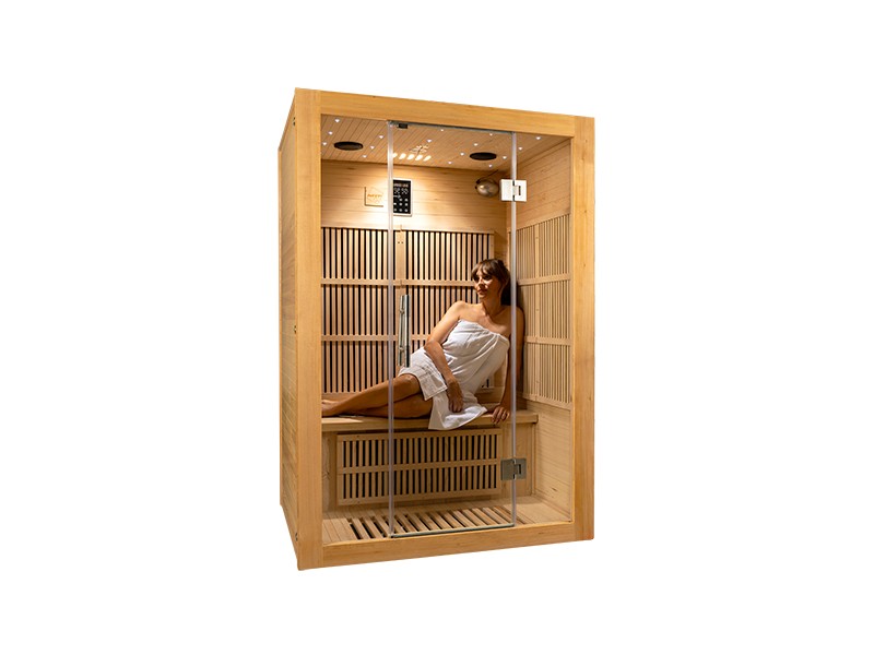 Das moderne Infrarotsauna-Modell Kaisa für zwei Personen besticht durch klare und elegante Linien. Die traditionell bewährte Kabinenform erhält durch die maximale Glasfläche der Fassade und die Deckenbeleuchtung eine neue Dimension.